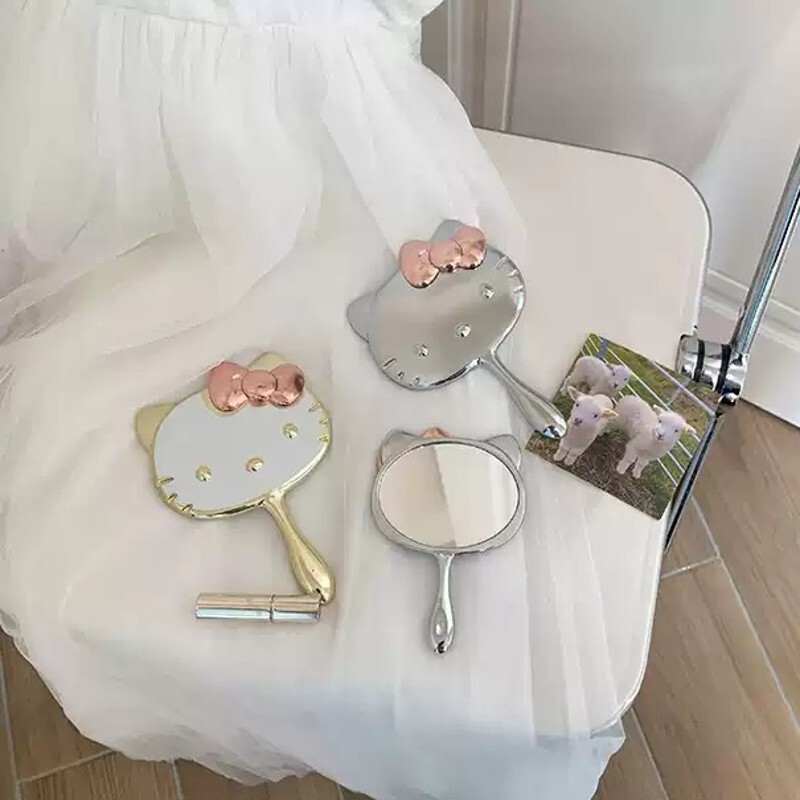 かわいい猫の小さな鏡の女の子が手で鏡を持ち、手持ちのメイク鏡、学生寮の折りたたみ取っ手鏡