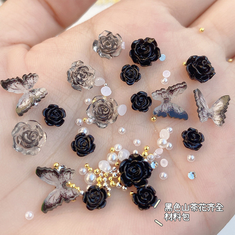 黒のブレンド椿蝶のジュエリー、インターネットセレブの氷の透明な黒の立体ローズフラワーアクセサリー、ネイルデコレーション