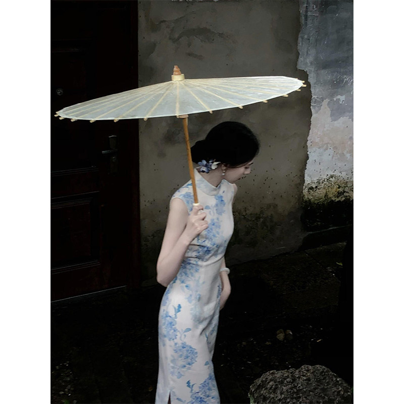 凌千河の青白磁器新作中国プリント改良型チーサム女性用春夏半袖ドレス、空洞ウエスト長スカート