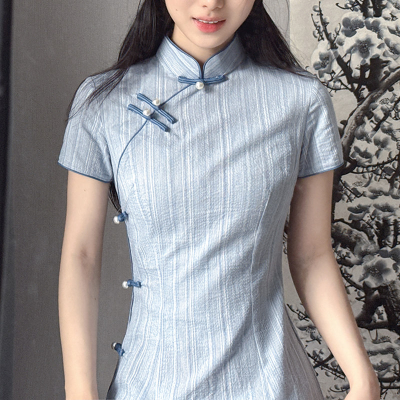 青いチャイナガールズの夏新2025年改良版リテロレトロ新中国の若いドレスは毎日着られます