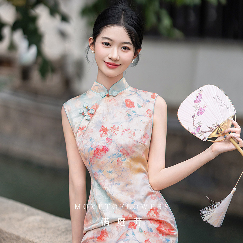 新しい中国風のチャイナサムドレス改良版ホットガールスタイルセクシープリントスリムヒップスカート 2025年夏