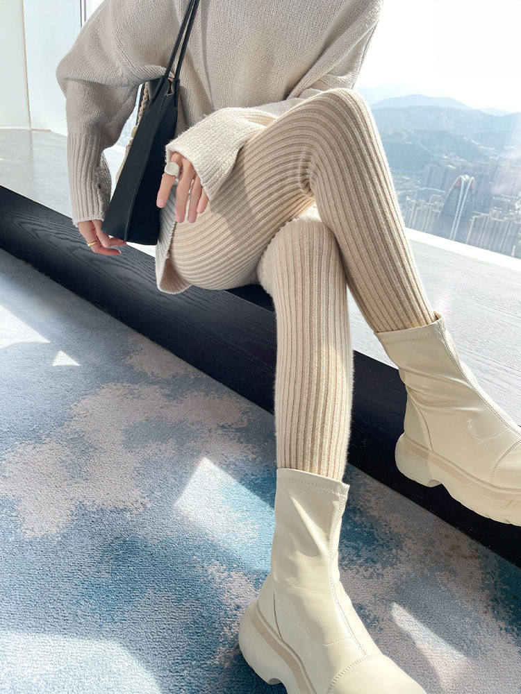 外側は糸編みのレギンスを女性が履き、秋冬には厚みのあるハイウエストのスリムフィットの暖かいパンツ、下には細身のクロップドパンツを履きます