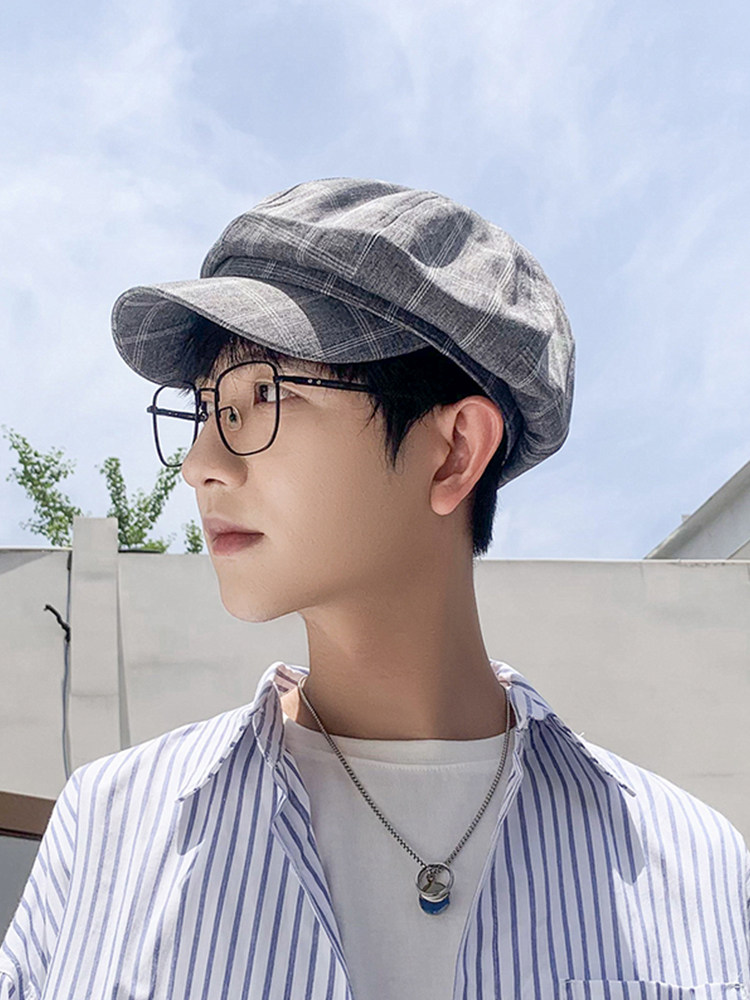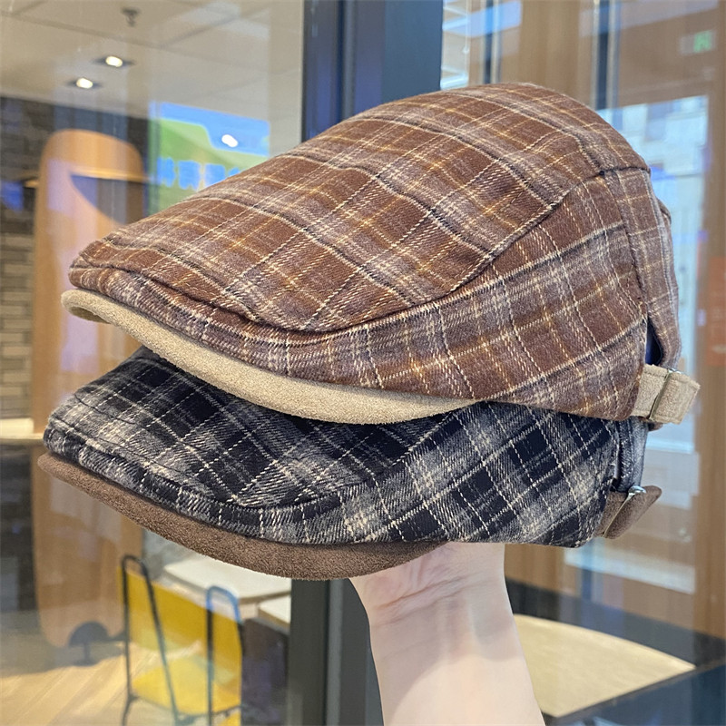 アメリカのレトロチェック柄の前方帽子、女性用の春・秋の新しいピーク付き帽子、ニッチな文学的・芸術的な顔、ニュースボーイ・ペインター帽