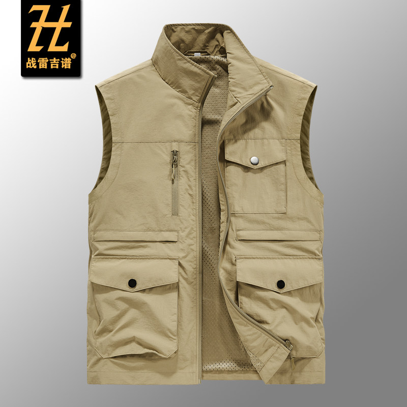 夏の日本ヴィンテージマルチポケットトレンド、ゆるいジッパー、カジュアルな立ち上げ襟、ノースリーブ、機能性ベスト、男女の肩