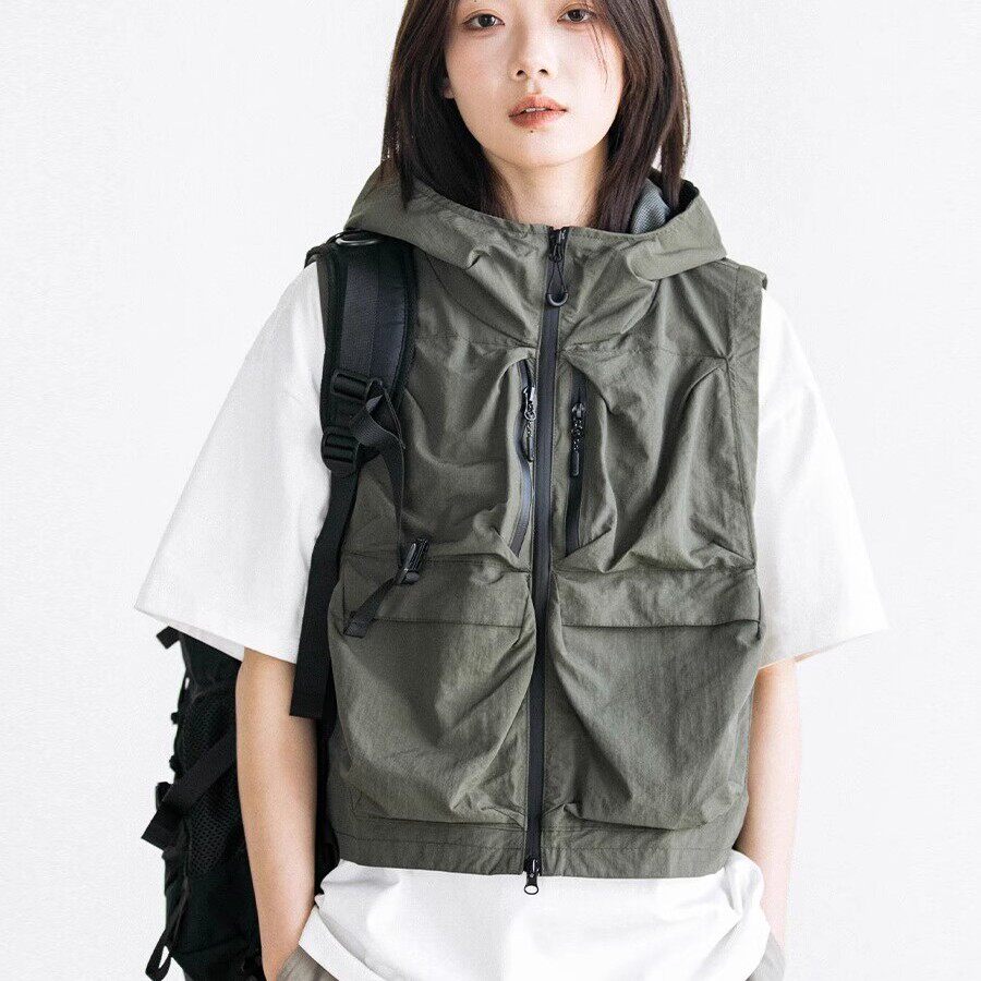日本のシンプルなアウトドア機能、マルチポケットショートフード付きベスト、男女キャンプ、釣り、防水ショルダージャケット、トレンディなスタイル