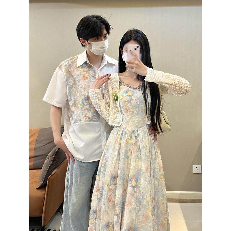 海辺のリゾートカップルの衣装、夏の半袖シャツ、高級な花柄スリップドレス、ツーピースセット、ワンピース、ワンピース