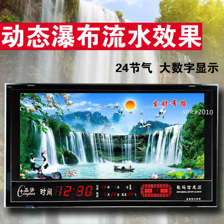 リビングルームの壁掛け、デジタル永久カレンダー電子時計、動的な流水風景画、風景画装飾、カレンダー壁掛け時計付きの家庭用