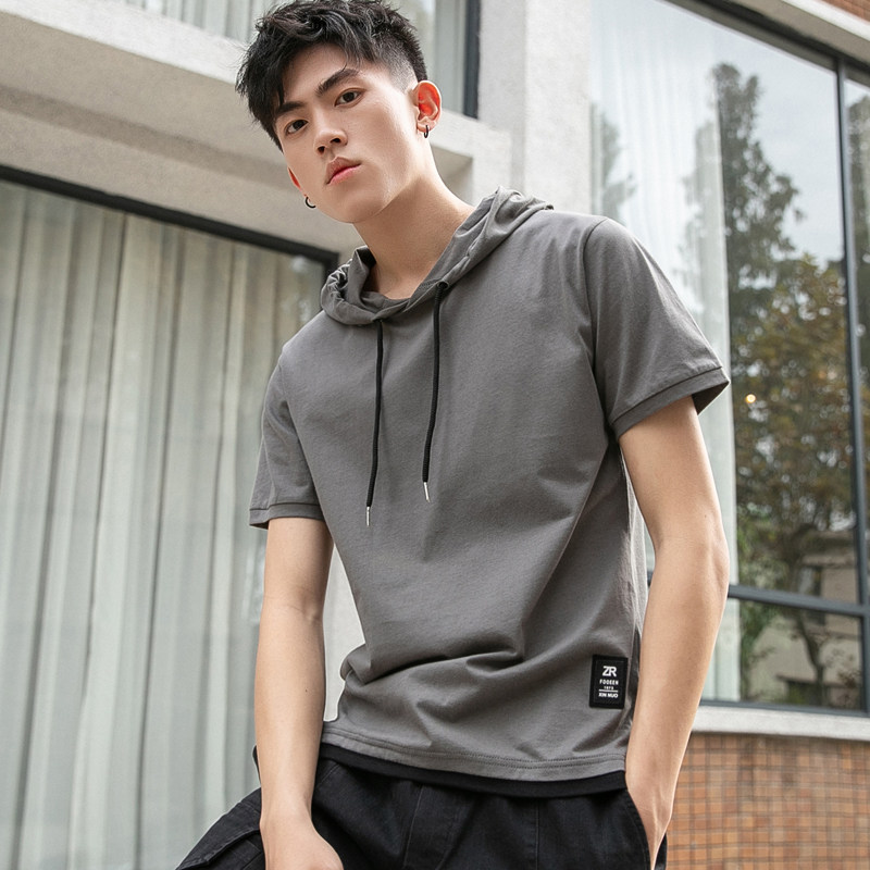 サマーニューメンズ半袖Tシャツ ピュアコットントレンド フード付き半袖スウェットシャツ 学生 帽子付き、無地のフーディー