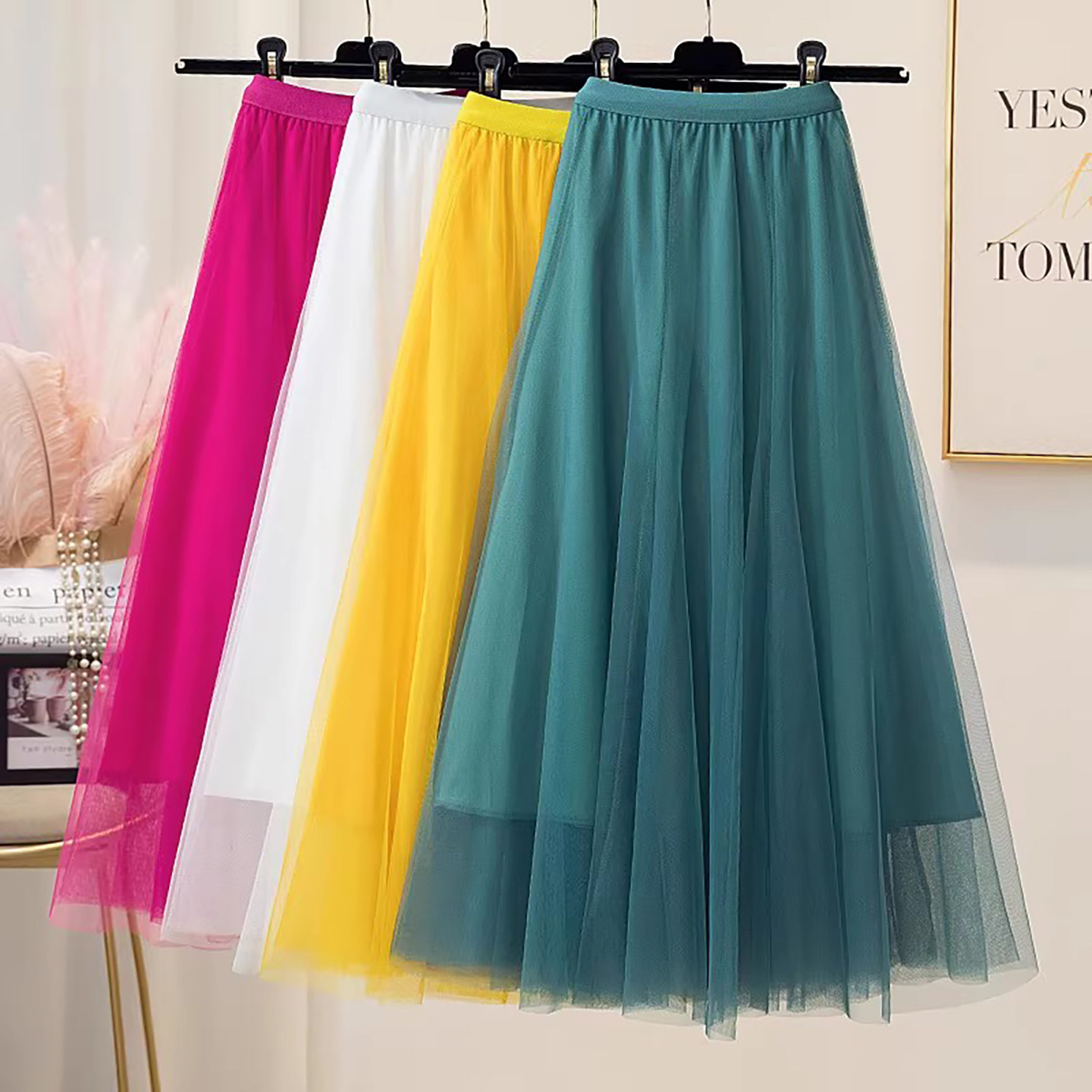 チュールスカートはふんわりした網目のチュール生地で作られているスカートです。軽やかなシルエットは春から夏にかけて涼しげな印象をもたらします。その名前は生地が元々フランスのチュールで作られていたことに由来します。-円