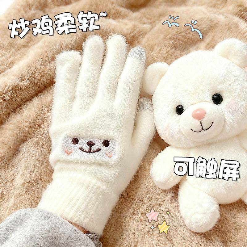 秋冬の女子暖かい学生向け手袋 韓国版のかわいいフリース厚みサイクリング 五指防寒 タッチスクリーンコットン手袋