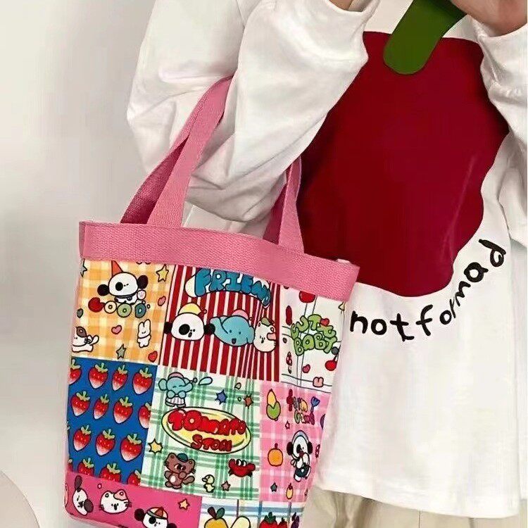 かわいいグラフィティバケツバッグ、プリントシリンダーバッグ、キャンバス弁当袋、韓国スタイルの女の子、手持ちのランチボックス、ママバッグ
