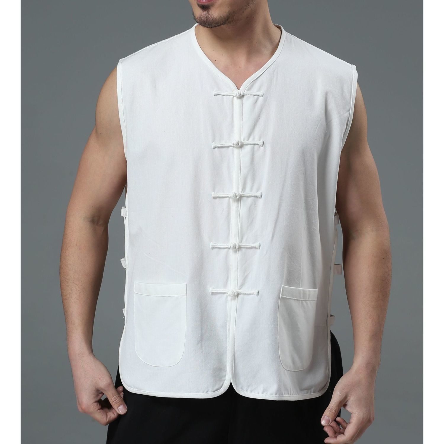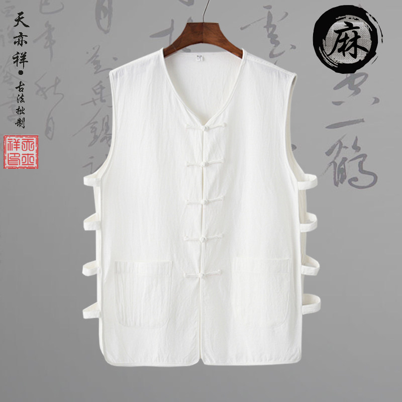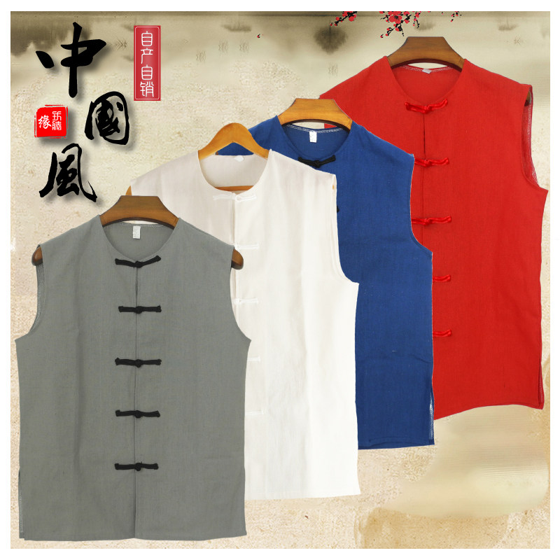リネンの中国式ベスト、男性のレトロな国民スタイルベスト、ノースリーブ乗馬ジャケット、唐の衣装パフォーマンス、老人のシャツ、古代のカン肩のバックル