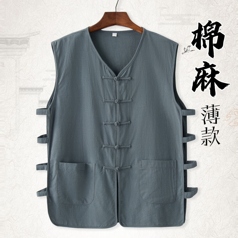 夏用薄リネン中国ベスト、タンベスト、バックル、レトロな北京漢シャツジャケット、中年および高齢男性服