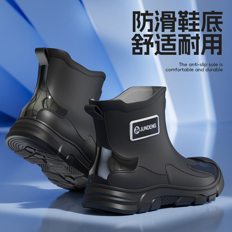 ショートレインブーツ、メンズの防水・滑り止めミッドレッグブーツ、雨の日のテイクアウトライダー、ロートップワークのラバーレインブーツ