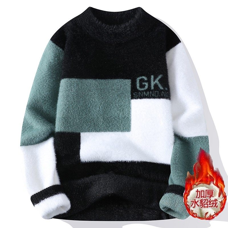 冬のセーター、男性用韓国版の厚手クルーネックミンクフリース、ティーンエイジャー、学生、長袖のボトムニットウェア、セータータイド