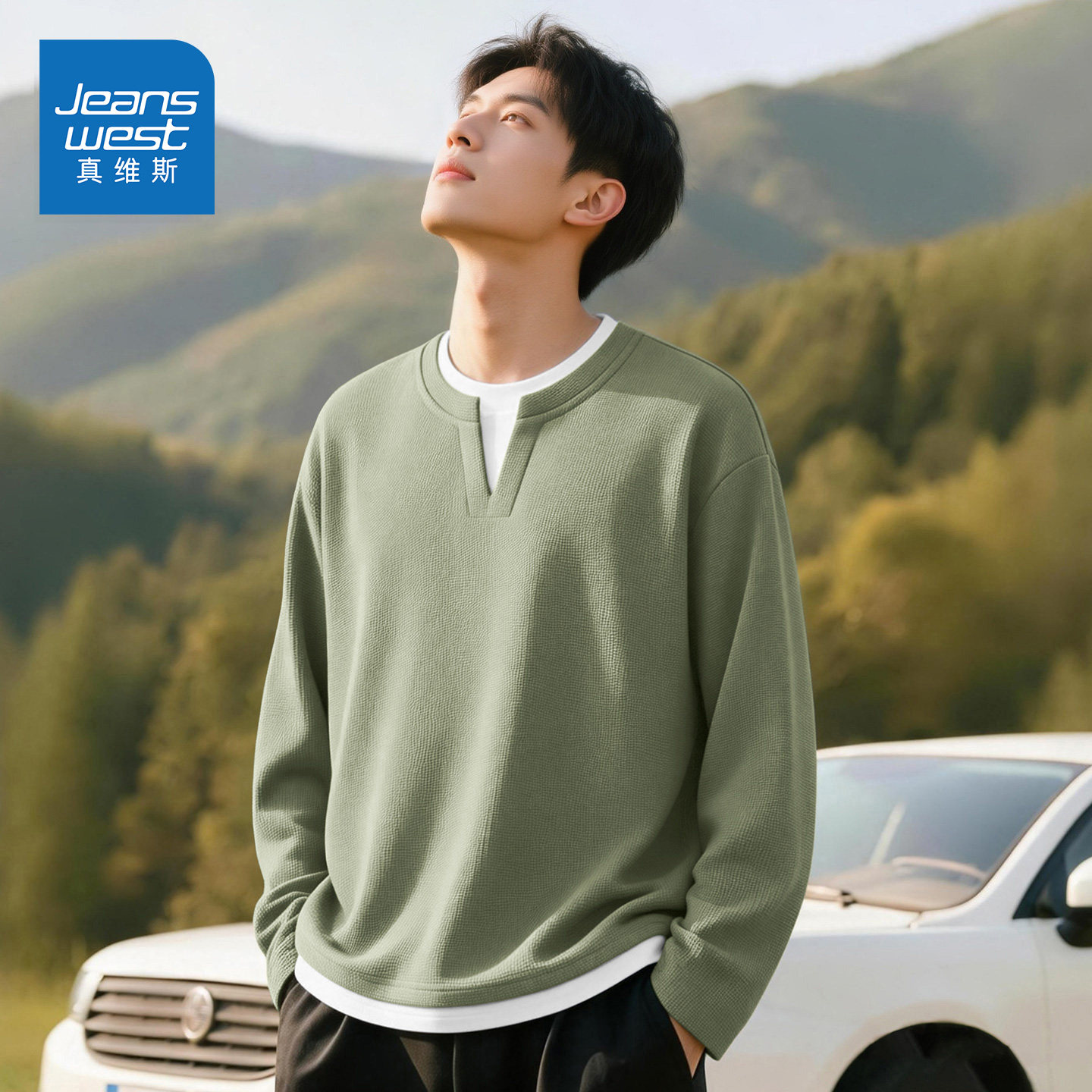 True Weiss Waffle フェイク 2本長袖メンズTシャツ 春 アメリカンテクスチャートレンド Vネック インナーシャツ F