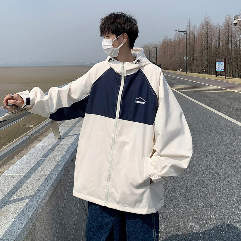 春と秋のレトロステッチング コントラストフード付きジャケット メンズ夏 ゆるい日焼け止め トレンディで多用途 カジュアルトレンチコート