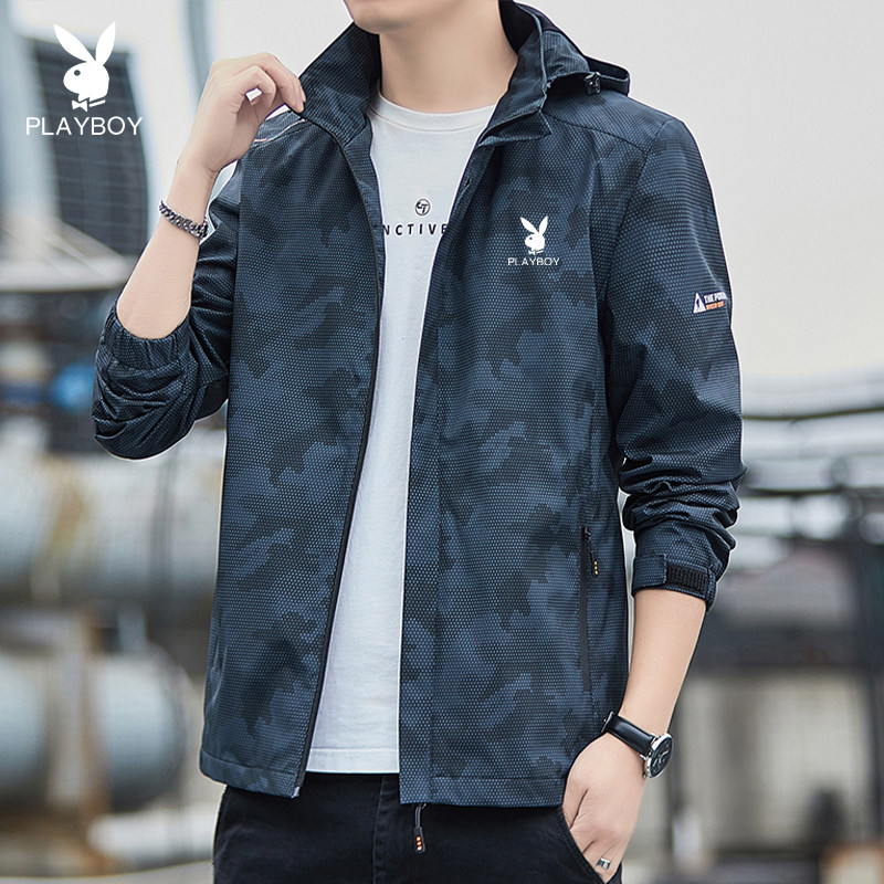 プレイボーイ トレンチコート ジャケット メンズ 春と秋 新しいフード付き迷彩 カジュアルスポーツウェア メンズアウトドアジャケット