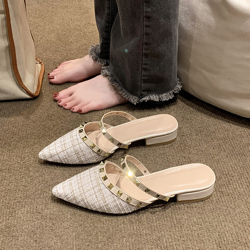 小さな香りの風の先頭つま先ハーフスリッパ 女性用 2026年春夏新ファッションスタッド ミッドヒール厚いヒール フレンチトゥサンダル
