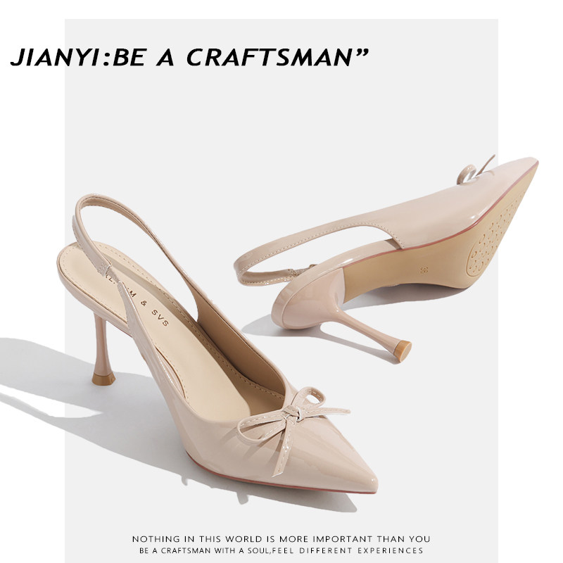 2025年ニューフレンチテンプラメント ヌード 尖ったつま先のリボン 浅いヒール サンダル 女性用 背中空のヒール つま先サンダル