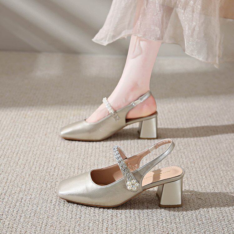 フレンチの厚手ヒールシルバートゥトゥサンダル、女性用2026年夏の新しいメリージェーン、スカートハイヒールと背中の空っぽの靴付き