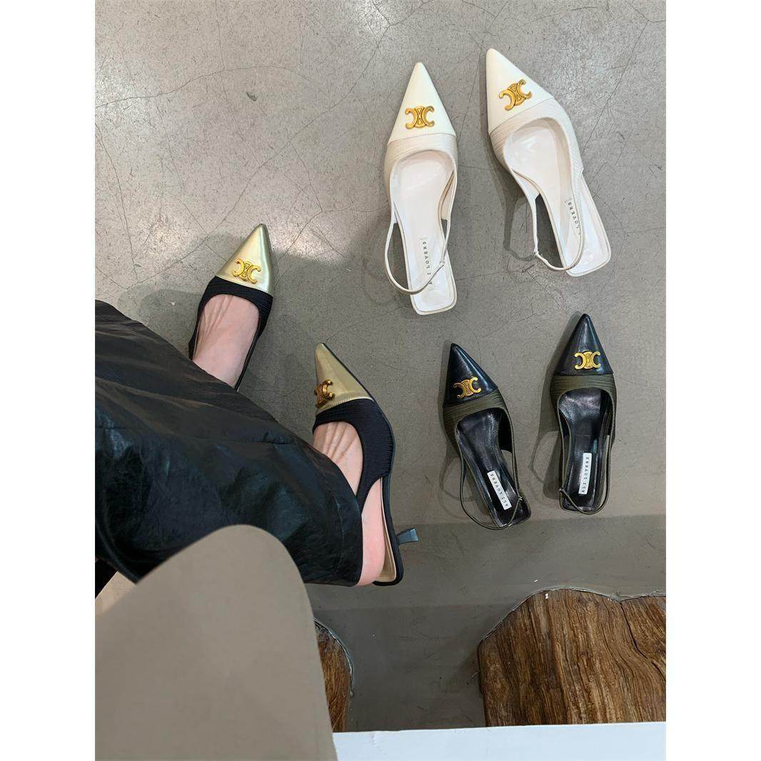 フレンチフレグランススタイル、ブラックゴールドのメリージェーン、トゥサンダル、女性用2026年夏の新しいスティレットヒール、バックエンプティシューズ
