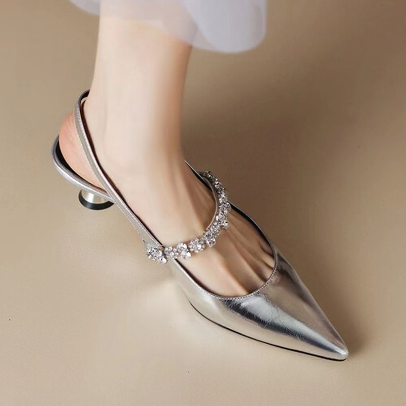 本革のシルバー フレンチラインストーン 後ろに先頭をつけた メアリージェーン スモールレザーシューズ 女性用 小さいヒール つま先 サンダル 女性用 夏用新品