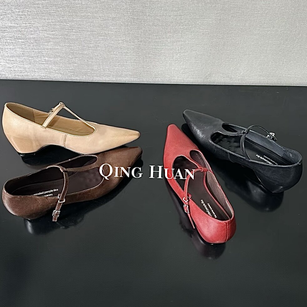 餃子 5CM レトロスタイル Tバックルストラップ 尖ったつま先の太いヒール メアリージェーンシューズ 女性用のニッチなパンプス