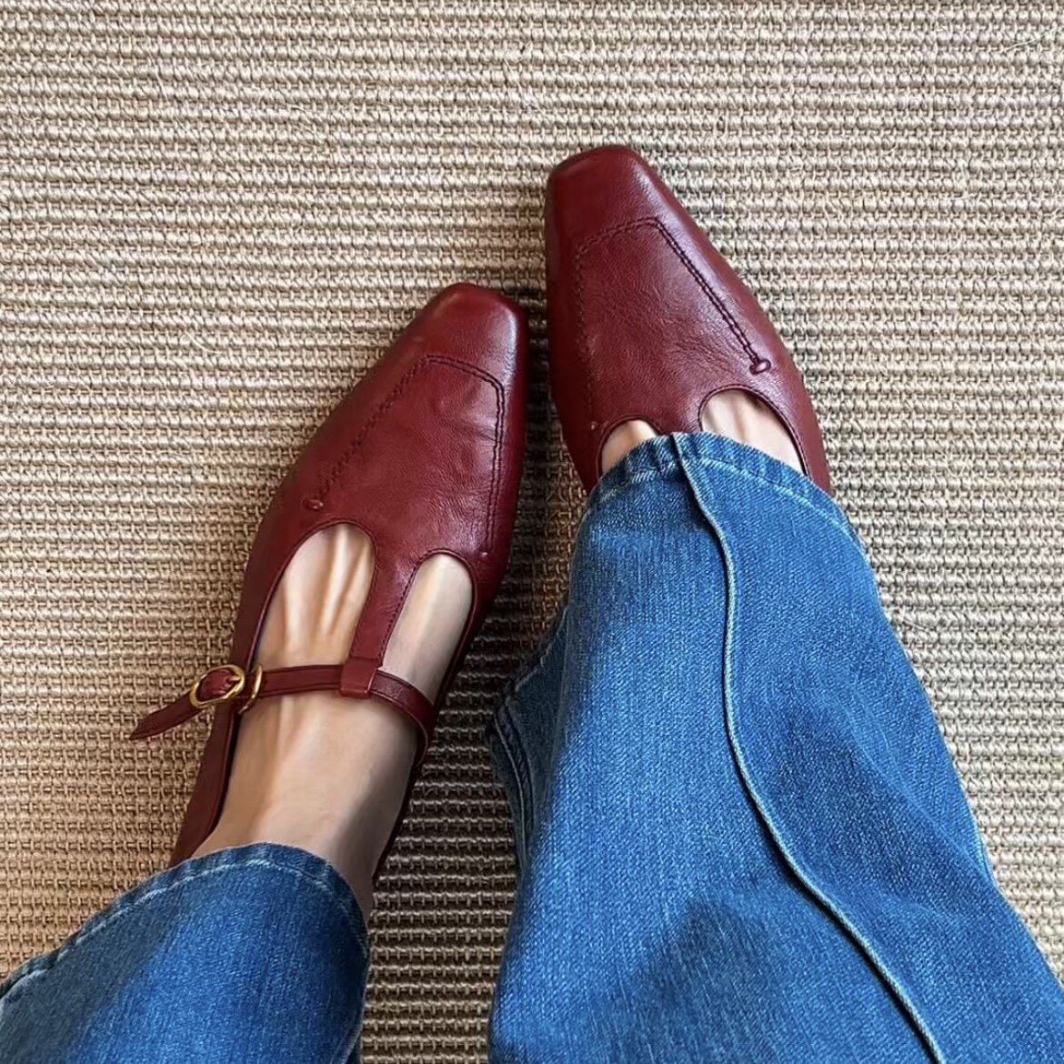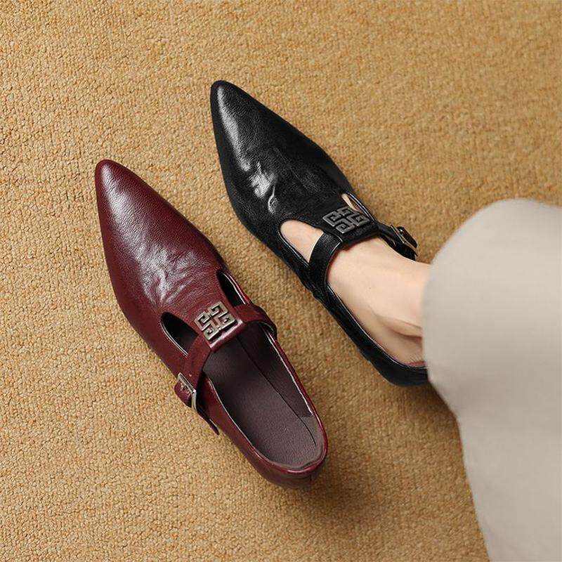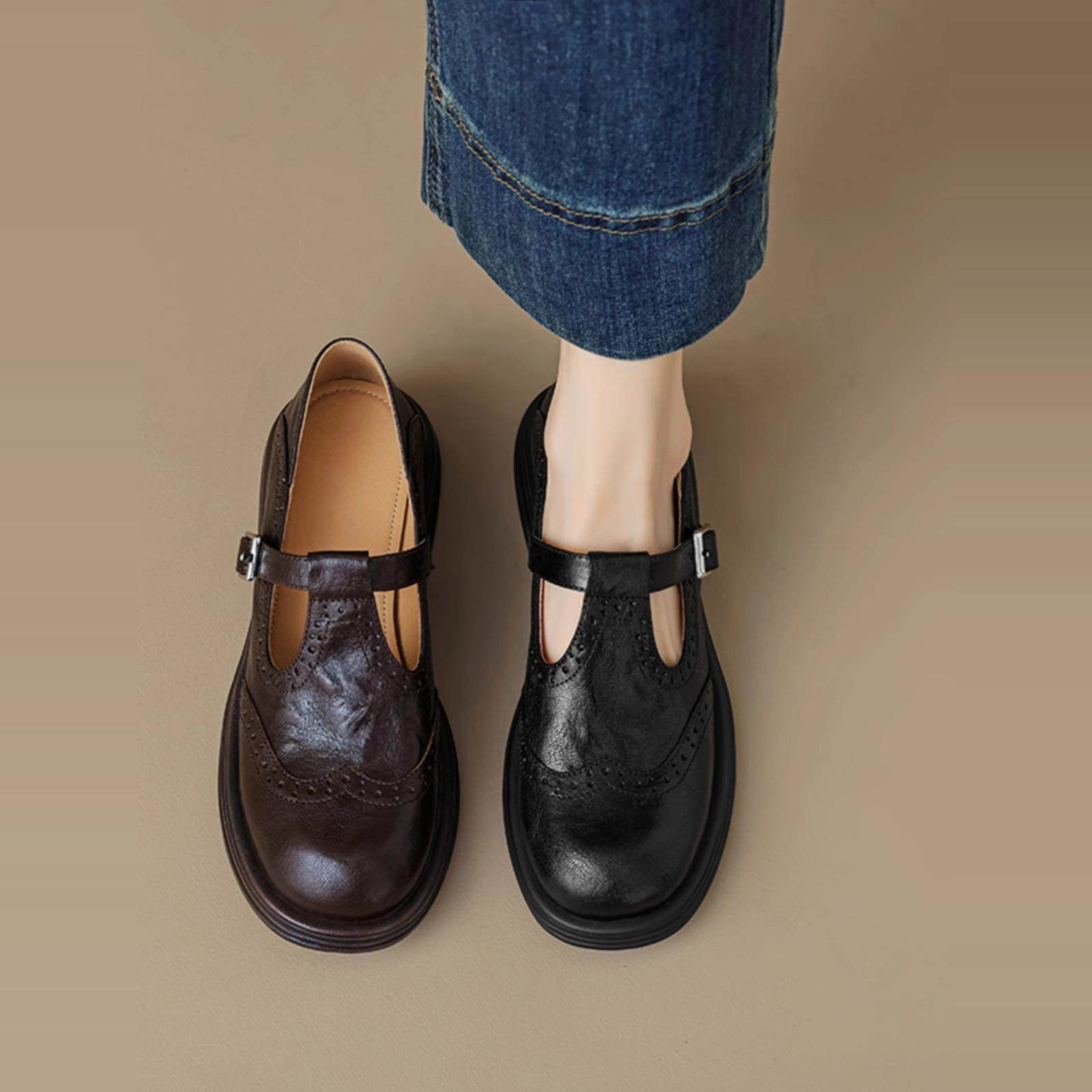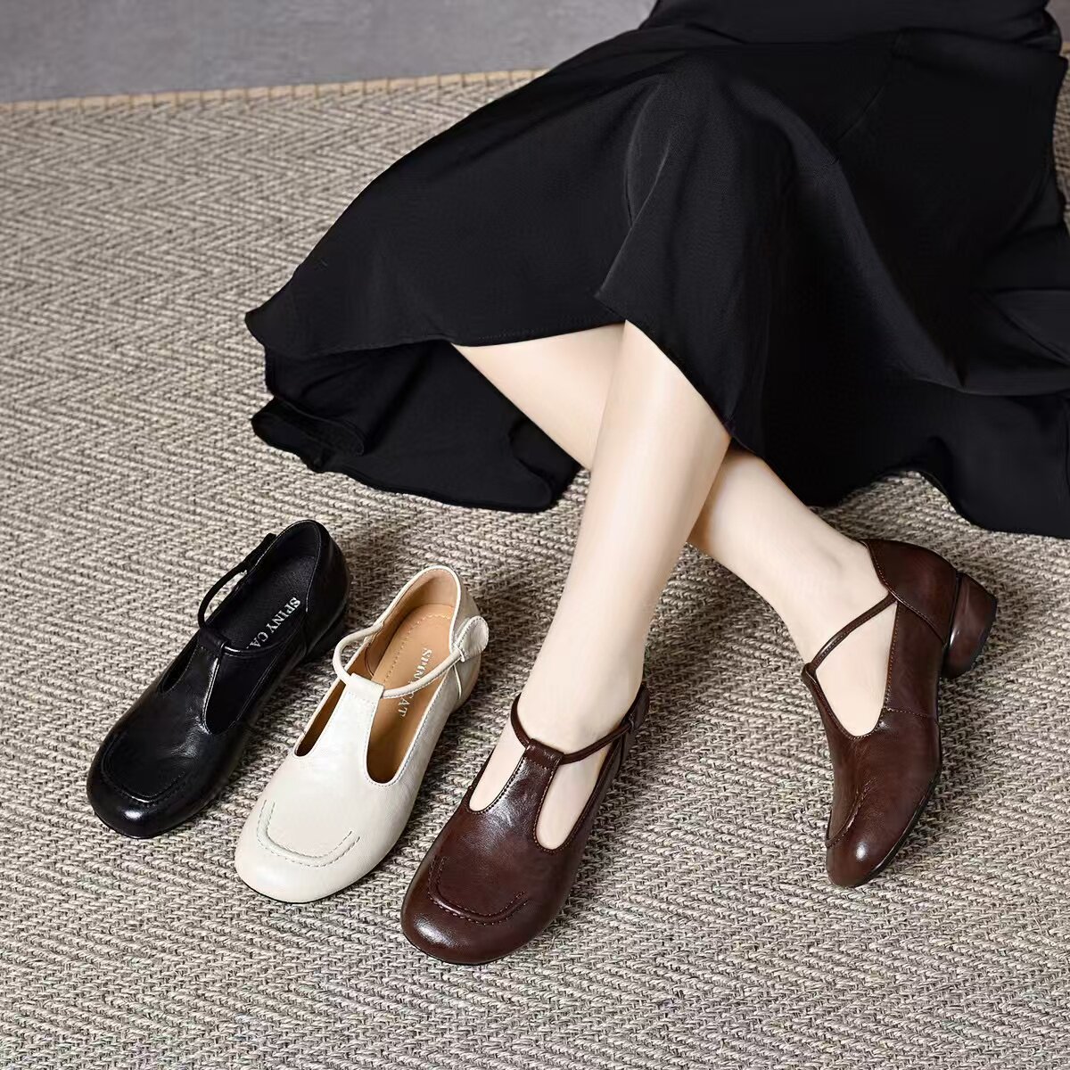 ラウンドトゥの手握りカウハイドTバックストラップシューズ 2026年春と秋の新しいローヒールのファッショナブルで快適な女性用シューズ