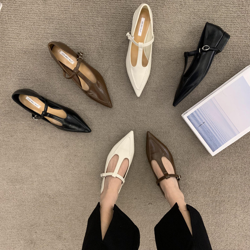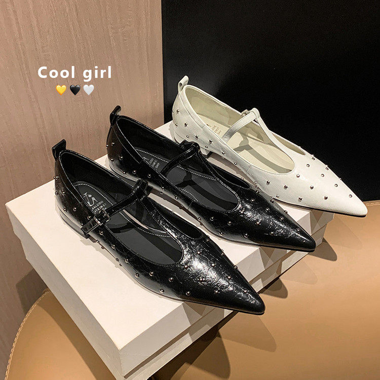 尖った鋲のシングルシューズ 2025年春 新しいレザーのローヒールTバックシューズは、外国風の女性用シューズをパンプアップします