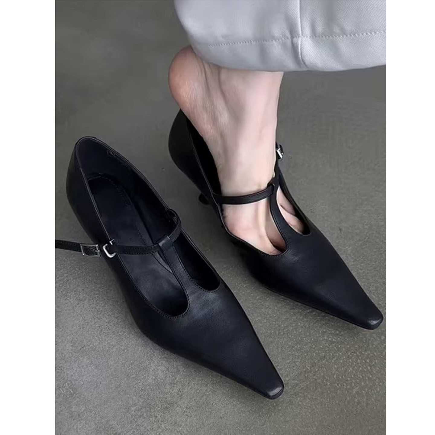 アンクルクッキー~ポインテッドトゥのスティレットヒールホロウメリージェーンシューズ、女性用2026年新型ハイヒールレザーTバックシューズ