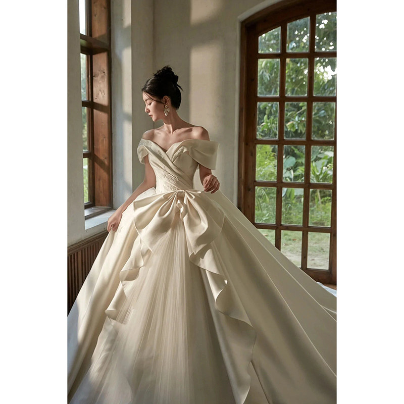 片肩サテンライトウェディングドレス 2026年新しいブライダルメイン糸 高級テクスチャー スモールマン 重工業 アウトヤーンテイル