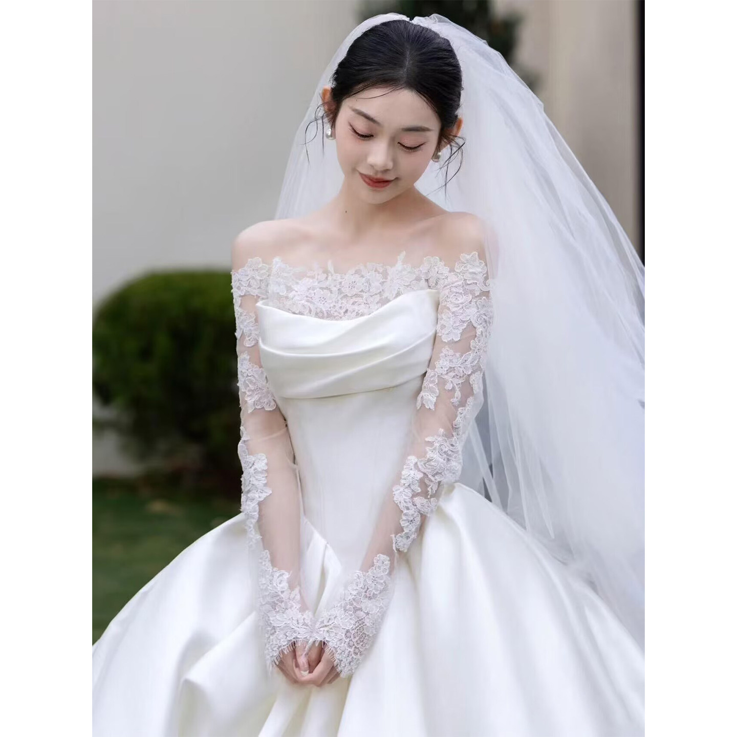 片肩長袖サテンウェディングドレス 2026年新品ブライダルメインベール フレンチライトラグジュアリー高級テクスチャートレーリング糸