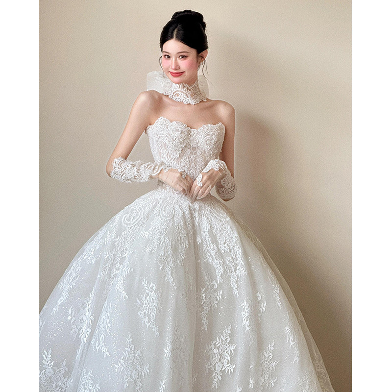 白のバンドーレースライトウェディングドレス 花嫁の2026年モデル シンプルで高級テクスチャーのトラベルテールメインヤーンガール