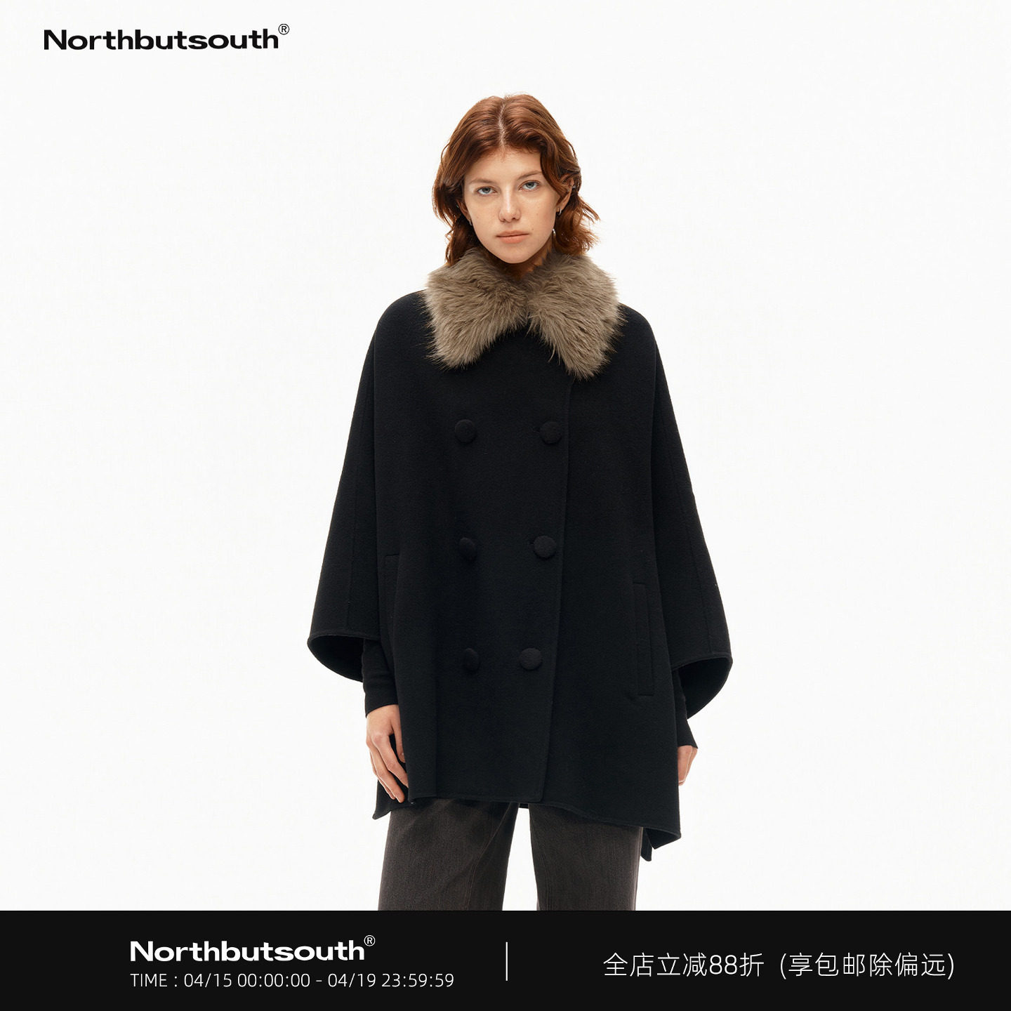 ノース・バットサウス フルウール ダブルブレスト 取り外し可能な毛皮 カラー ゆるいケープ リバーシブル ツイードコート