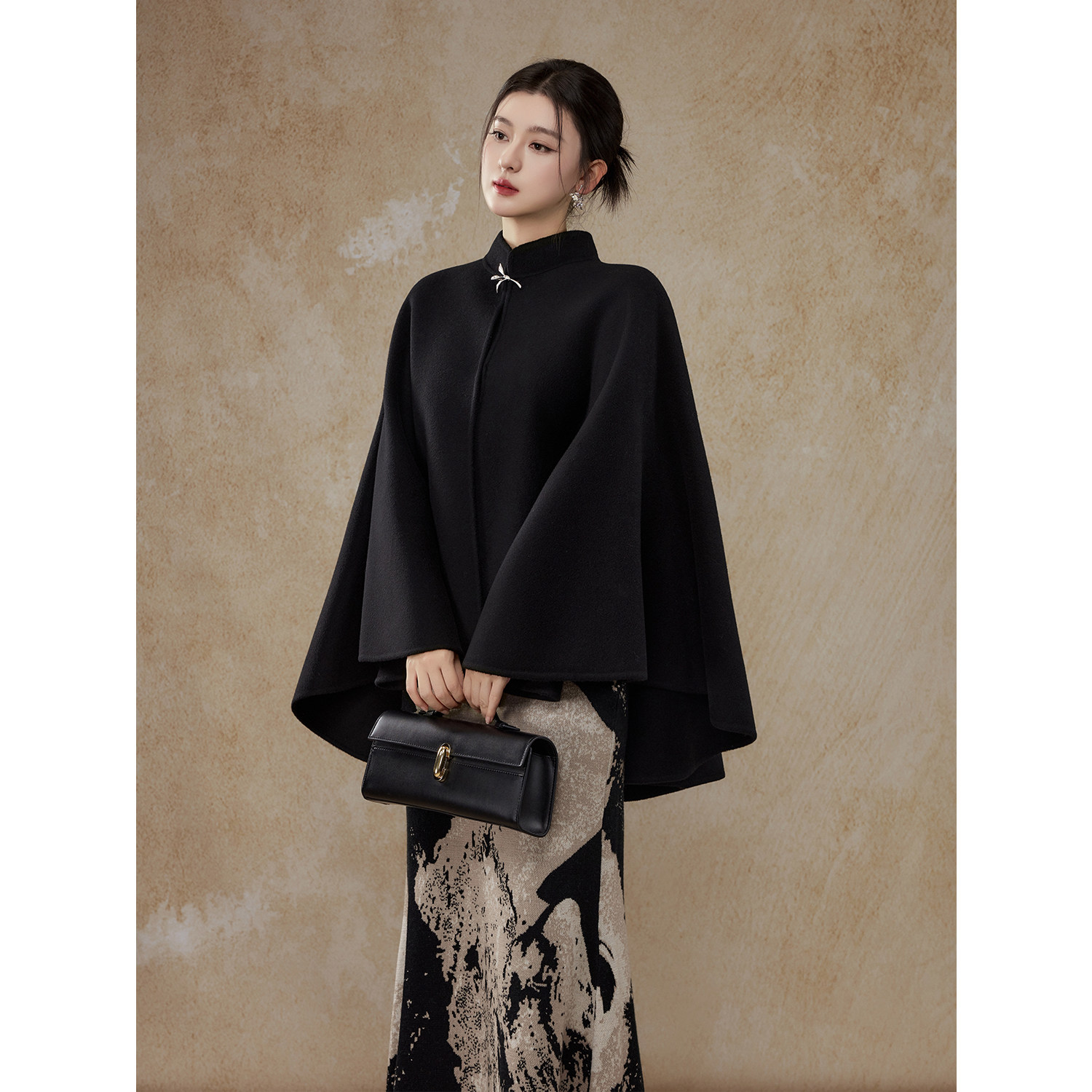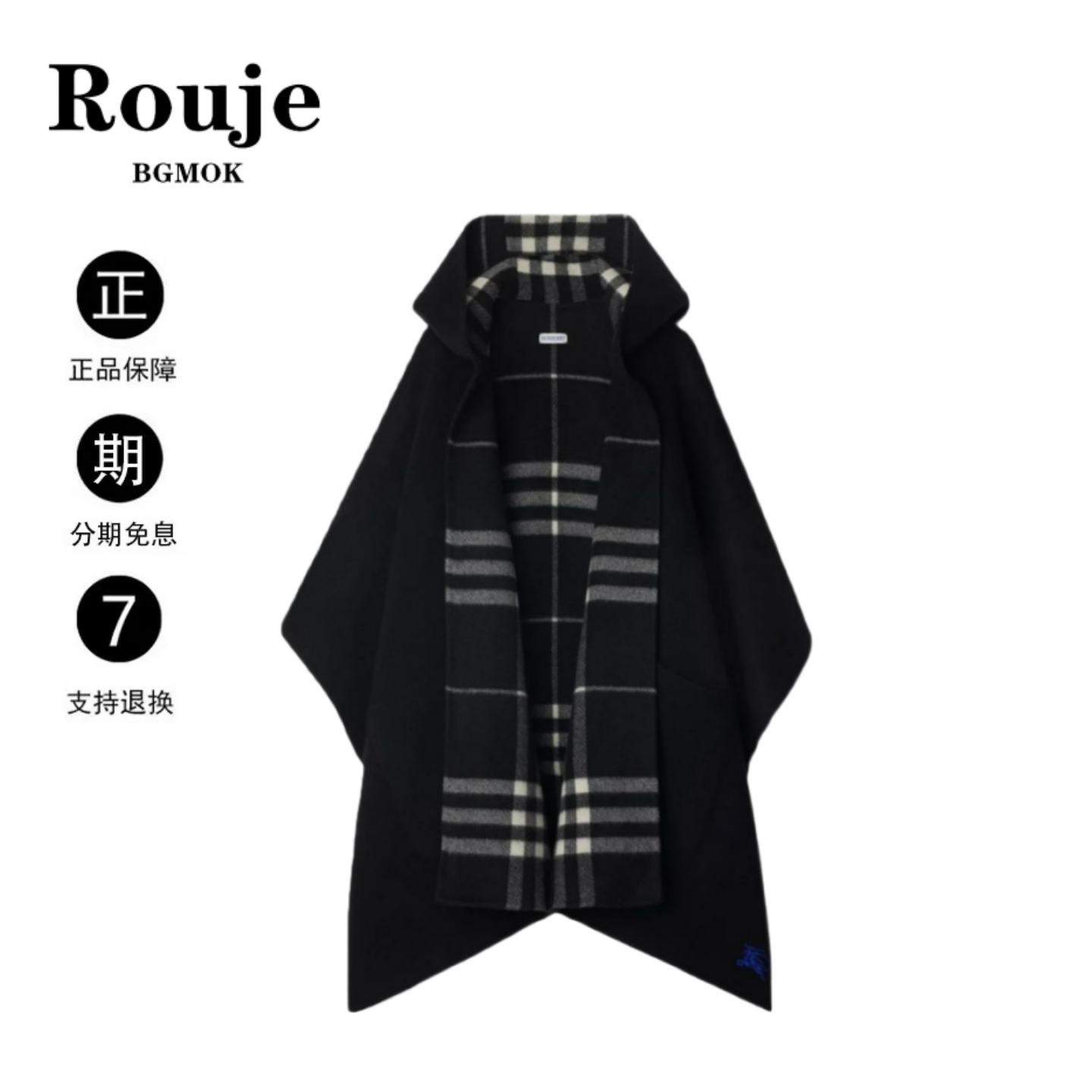 ROUJE BGMOKの張景怡は黒のチェック柄ショールケープとオーストラリア産ウールのリバーシブルフード付きジャケットにマッチしています