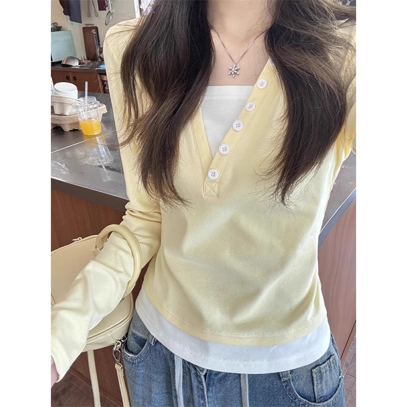 秋の前のクリーミーイエロー、フェイクのツーピース長袖Tシャツ 2026年レディース スリムボディストレートショルダーショートデザインのベースシャツトップ