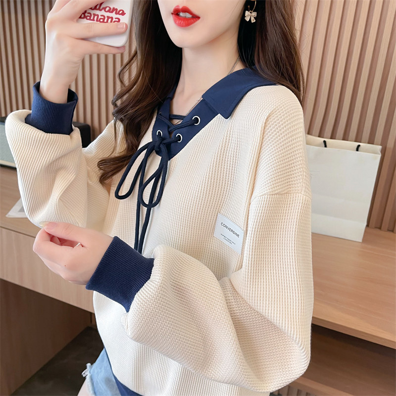 ポロカラーワッフルスウェットシャツ 女性用春・秋薄型 2026 新しいゆったりした韓国デザイン コントラストラペルトップ