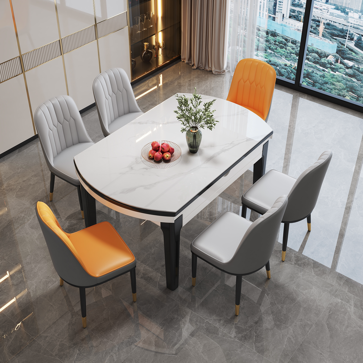 スレートダイニングテーブルとチェアの組み合わせ、モダンシンプルで軽やかなホームダイニング、折りたたみ式ダイニングテーブル、可変丸テーブル、小さなアパートタイプ