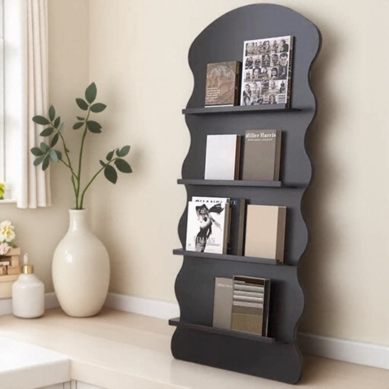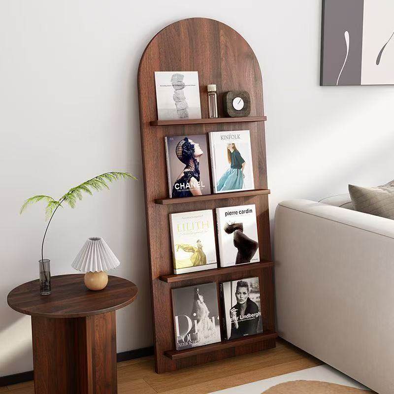 インターネットセレブリティのインススタイル、中古雑誌ラック、床、壁に置かれた新聞ラック、新聞ラック、無垢材の多層棚