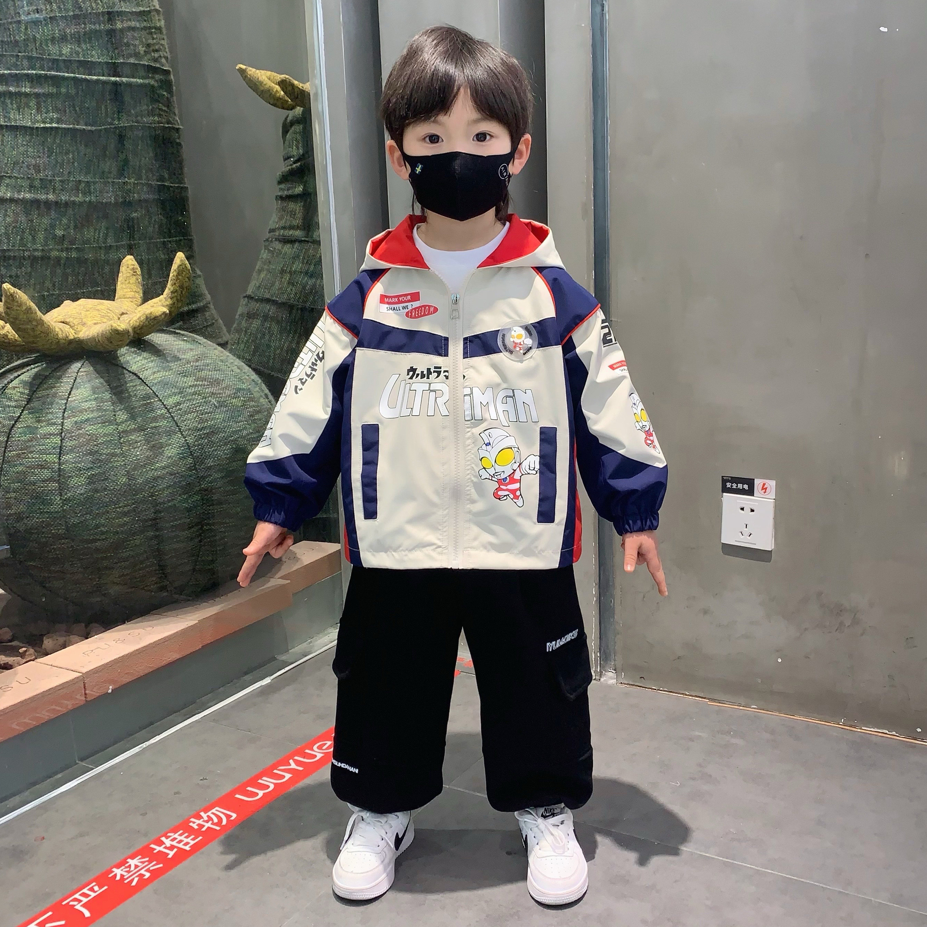 ウルトラマンの服、少年の春ジャケット、2026年の新しい子供用ラフィアン、ハンサムな外国風のフード付きトップス、メンズのトレジャージャケット