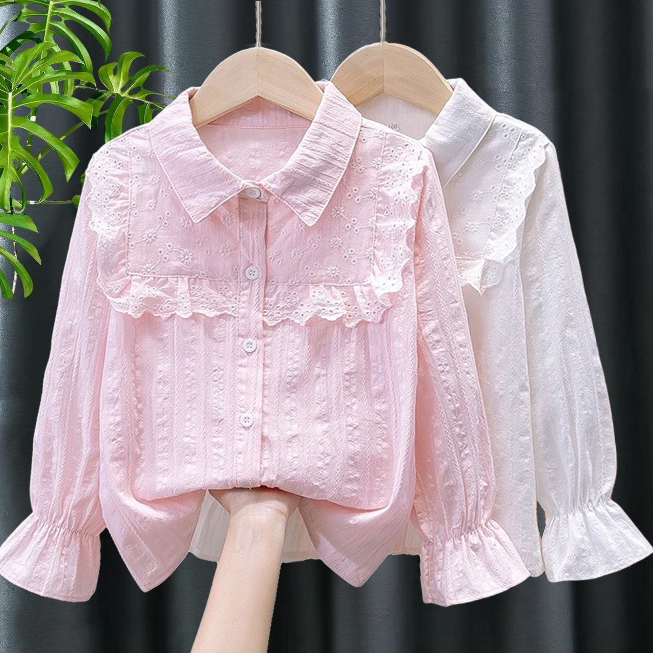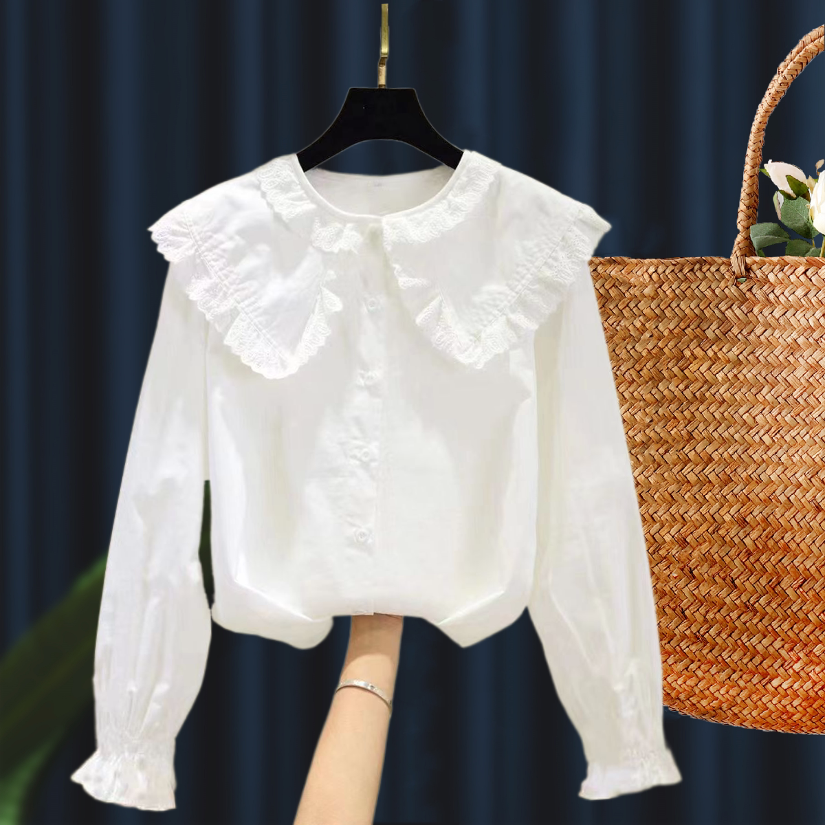 女の子用コットンドールカラー長袖シャツ 春・秋 2026年新作 中・大きめ子供向け外国風 子供用ホワイトパフォーマンストップ