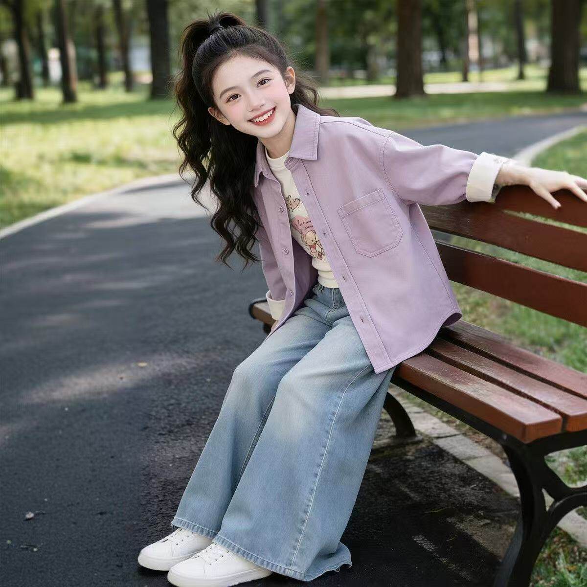 女の子ジャケット 春 新作 中 厚手 晩秋の女の子デニムシャツ 2026年秋の衣装 中大から大きめの子供用長袖トップス