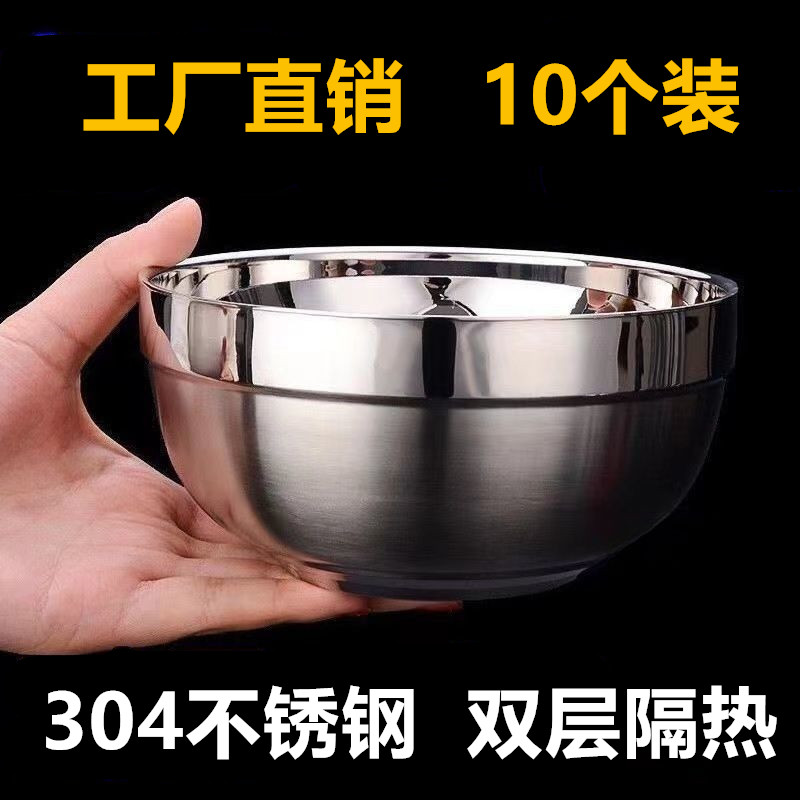 【10ピース】304個のステンレス製ボウル、二層家庭用米丼、市販の焼け止め麺ボウル、大人用の小スープボウル