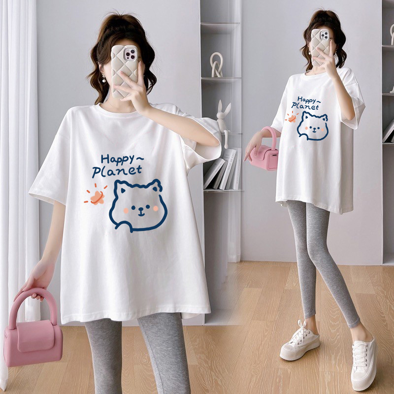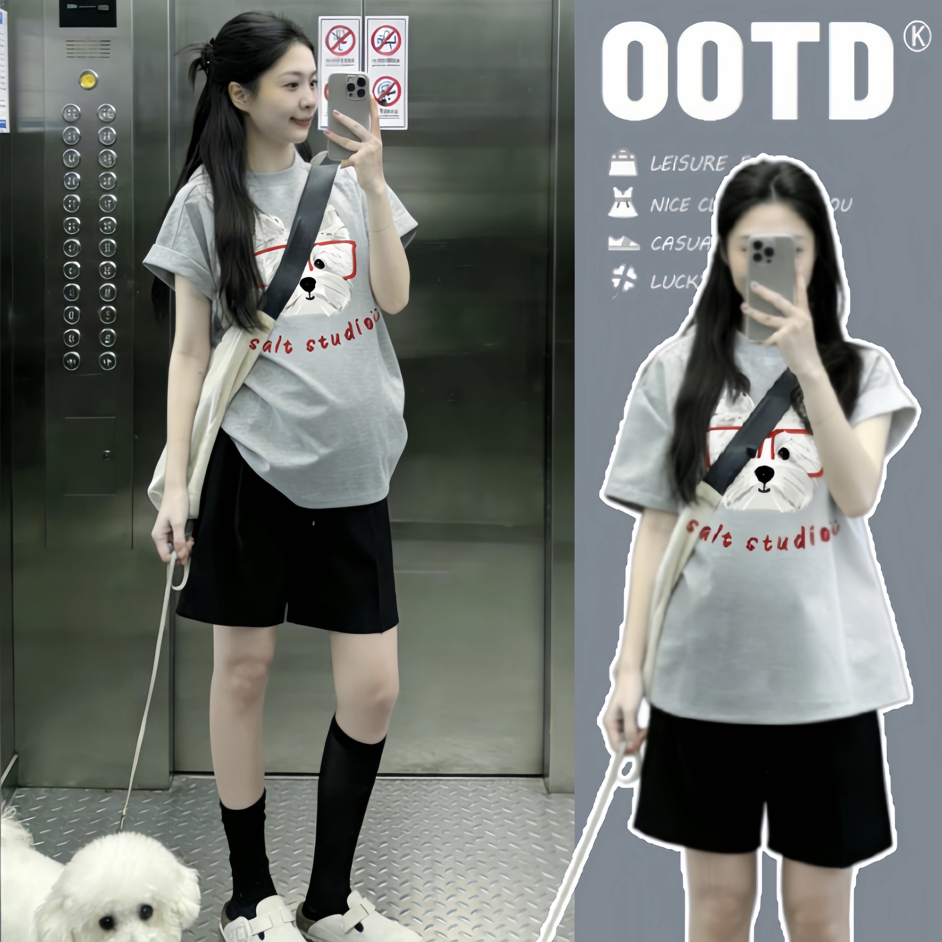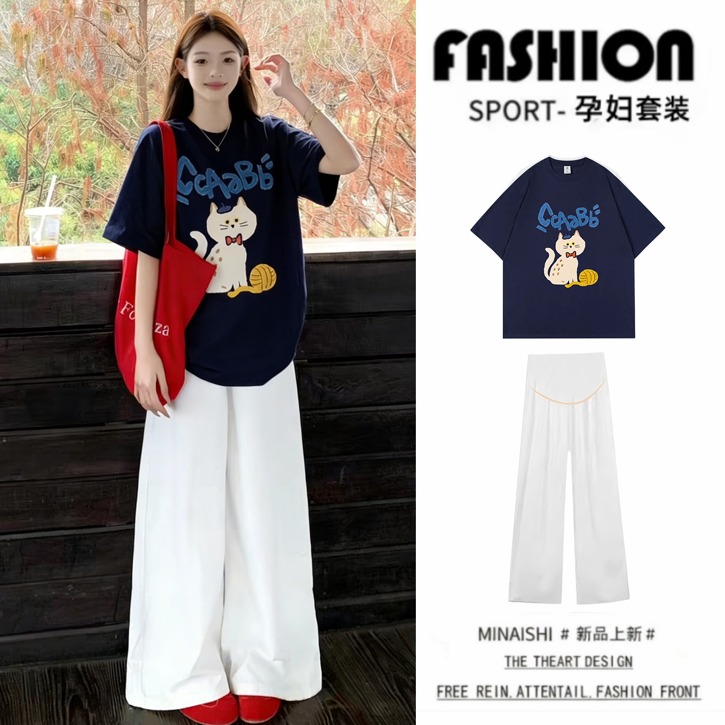 マタニティトップス、夏のコットンプリント、ゆったりした韓国版半袖Tシャツ、スリムなパンツ、妊婦用スーツは見せない