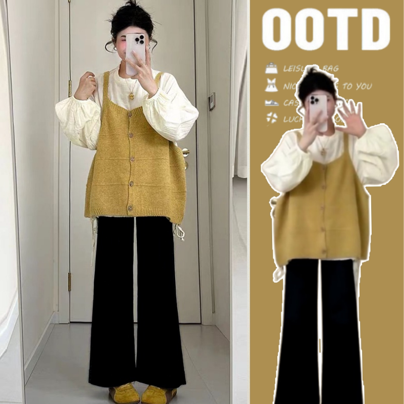 マタニティ衣装 春の妊娠中ファッション ニットベスト 長袖ワイドレッグパンツ スリーピースマタニティ 2026年モデル