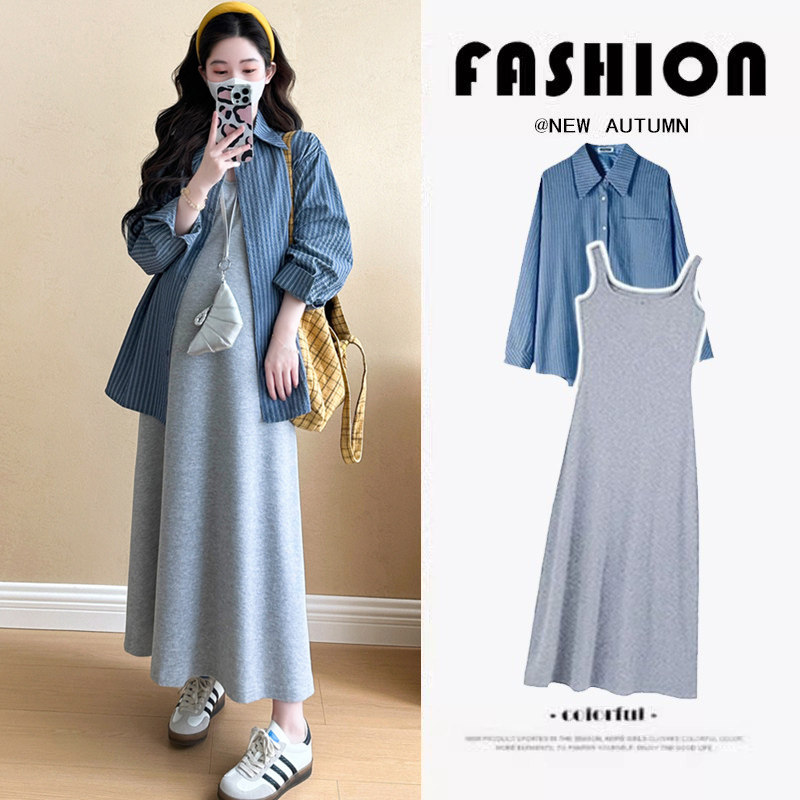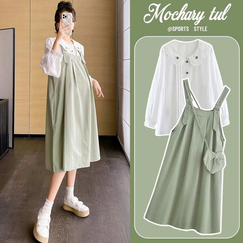 妊婦用春ドレス 2026 新しいプラスサイズ外国風春秋サスペンダースカートセットはお腹を覆うファッションのツーピースセット