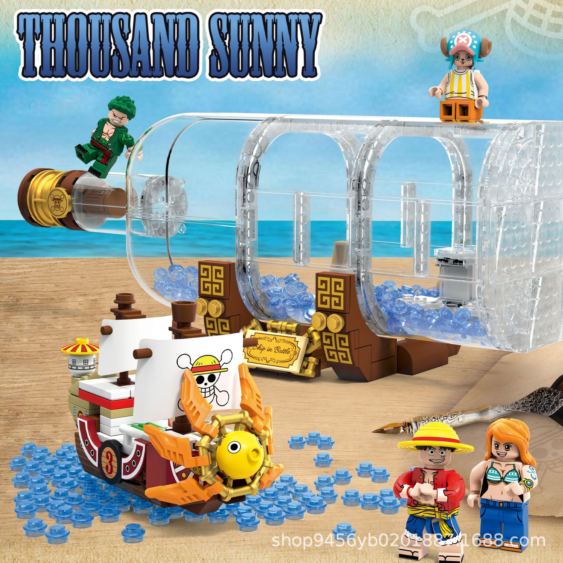LEGO透明な青い海水粒子、オーシャンキャッスル、ボトル、ボトルの中のボート、ビーチウェーブ、シーン、アクセサリー、ライトに対応しています