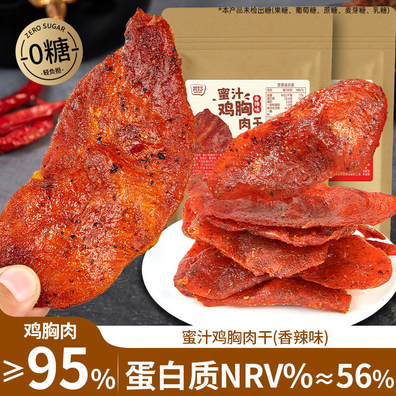 0. モラセスソース、鶏むね肉ジャーキーストリップ、スパイシーチキンジャーキー、食事代替、空腹感とおやつを満たすためのスナック
