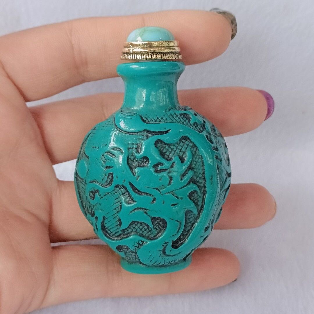 アンティークコレクションの模造ターコイズスナッフボトル、両面の彫刻スナッフ器具、内側の絵画、スナッフボトルの取っ手オーナメント